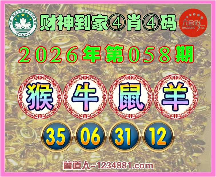 058期:『财神到家』 ♣️④肖④码 ♣️【猴牛鼠羊】【35.06.31.12】开:鼠31准