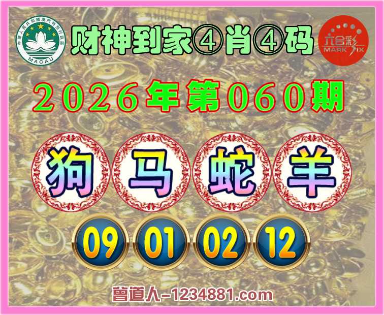 060期:『财神到家』 ♣️④肖④码 ♣️【狗马蛇羊】【09.01.02.12】开:狗09准